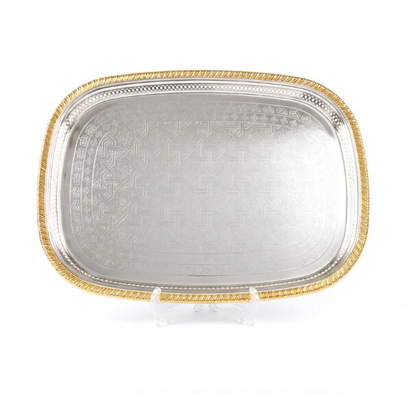 Plateau rectangulaire en métal argenté avec poignées dorées